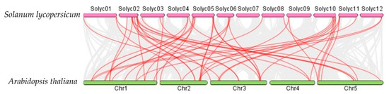 Syntenic analysis between AAt regions of Solanum lycopersicum and Arabidopsis thaliana. Gray lines in the background indicate collinear blocks between Solanum lycopersicum and Arabidopsis thaliana, while red lines highlight syntenic AAT gene pairs.