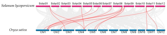 Syntenic analysis between AAt regions of Solanum lycopersicum and Oryza sativa. Gray lines in the background indicate collinear blocks between Solanum lycopersicum and Oryza sativa, while red lines highlight syntenic AAT gene pairs.