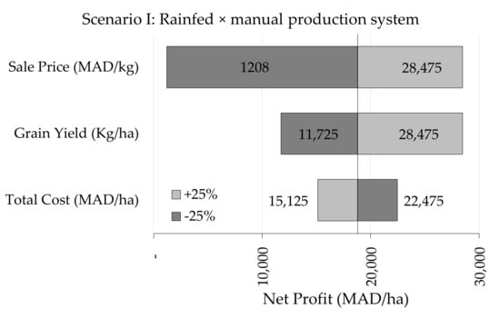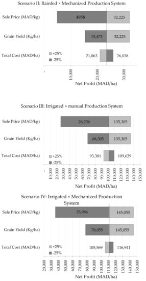 2.4.3. Sensitivity Analysis of Net Margin vs. Production Cost, Grain Yield and Sale Price