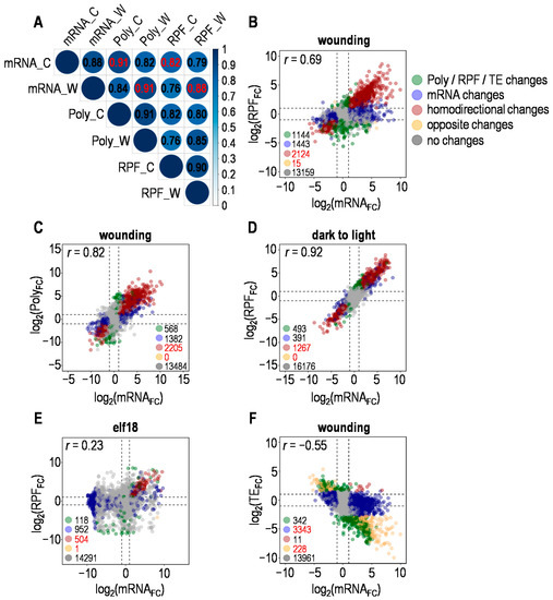 To ask how wounding affects the gene expression at both transcriptional and translational levels simultaneously, correlation analysis was conducted between the transcriptome and translatome. In contrast to the strong correlation among the overall levels of total mRNAs (mRNA), polysome-associated mRNAs (Poly) and ribosome-protected fragments (RPF) (Figure 1A), the fold changes (wounding/control) in total mRNAs and RPFs were not so well correlated (r = 0.69; Figure 1B); however, relatively high correlation was still found between the fold changes in total mRNAs and polysome-associated mRNAs (Poly) (r = 0.82; Figure 1C), indicating that upon wounding, transcribed mRNAs were proportionally engaged with the translation machinery, while ribosomes would not evenly load onto the polysome-associated mRNAs by the same proportion. A similar analysis was performed for the publicly available data produced from Arabidopsis treated with elf18, heat, hypoxia, dark to light transition and Pi starvation (Table 1) [12,25,26,27,28]. Differential correlations between fold changes in total mRNAs and RPFs were unveiled upon distinct stresses (Figure 1D,E, Figures S4 and S5), where the high correlation between total mRNAs and RPFs changes upon dark to light transition (r = 0.91; Figure 1D) was largely lost during elf18-induced immune response (r = 0.23; Figure 1E).
