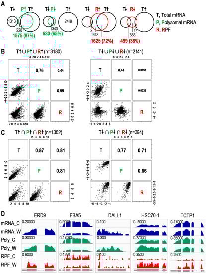 Recent years have also seen a substantial interest in dissecting the relationship between transcriptional and translational regulations in yeasts, plants and mammals under diverse stresses or across different tissues [15,16,17,18,19,20,21,22,23,24]. However, most of these studies assess the mRNA translation through polysome profiling, which cannot measure the exact number of ribosomes loading on polysome-associated mRNAs for each gene [19,20,21,22,23]. By contrast, a few studies comprehensively investigated the translatome based on ribosome footprints [15,16,17,18,24]. For instance, one study in yeast observed that under severe stress conditions such as amino acid depletion or osmotic shock, changes in the transcriptome (mRNAs) correlated well with those in translatome (RPFs), while hardly any or relatively poor correlations were found between these two levels in response to mild stresses induced by calcofluor-white and menadione [15]. Another study in yeast revealed the homodirectional regulation of transcriptome (mRNAs) and translatome (RPFs) in response to hydrogen peroxide [24]. Moreover, the comparative transcriptome (mRNAs) and translatome (RPFs) analysis in human primary hepatocytes under hypoxia demonstrated that translational responses preceded and were predominant over transcriptional responses [16]. Remarkably, a recent study [18], using Ribo-seq and matched RNA-seq data to compare transcriptome (mRNAs) and translatome (RPFs) in three primary organs across five representative mammals and a bird, uncovered the differential regulation and coevolution between the two expression layers, thus providing a substantial insight into their interplay in mammalian organs. These studies revealed the complexity of coordination between transcriptome (mRNAs) and translatome (RPFs) both in yeasts and mammals. In plants, plenty of stress-responsive transcriptomes (mRNAs) and translatomes (RPFs) have been profiled [12,25,26,27,28]; however, in contrast to the studies in yeasts and mammals, relatively few comparative analyses were conducted to examine the interrelation between them.