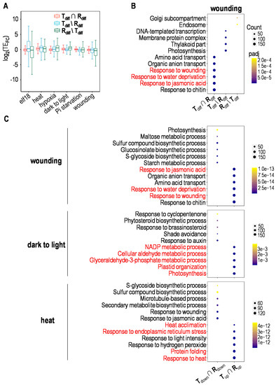 Targeted translational response to wounding. (A) Translational efficiency (TE) of genes altered merely at transcriptional or translational level as well as those changed at both levels in response to different stresses. Tdiff ∩ Rdiff represents genes differentially expressed at both transcriptional (mRNA) and translational (RPF) levels; Tdiff\Rdiff represents genes differentially expressed solely at transcriptional level; Rdiff\Tdiff represents genes differentially expressed solely at translational level. (B) Functional categories of differentially expressed genes under wounding. Details were as described for (A). (C) Functional categories of up- or downregulated genes under wounding, dark to light transition or heat. Tup ∩ Rup represents genes upregulated at both transcriptional (mRNA) and translational (RPF) levels; Tdown ∩ Rdown represents genes downregulated at both transcriptional and translational levels.