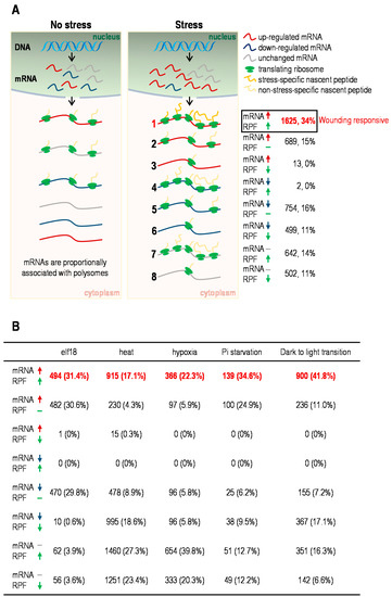 Schematic of stress-dependent translational control. (A) The genetic information stored in DNA leaves the nucleus as mRNA to be translated in the cytoplasm; red, blue and grey curves represent upregulated, downregulated and unchanged mRNA molecules respectively under specific stress such as wounding; 1~8 represent genes that undergo different types of transcriptional and/or translational regulation, total of which are the same set of genes as in Figure 1B excluding those with no significant changes at both levels. Gene numbers and proportions for each type of regulation under wounding are indicated on the right, among which there are 1625 (34%) typical wounding responsive genes with coordinately upregulated total mRNA and RPF termed type 1. (B) Gene numbers and proportions for each type of regulation under indicated stresses. Genes upregulated at both transcriptional and translational levels are critical for corresponding stress response (Figure 3C, Figure S8).
