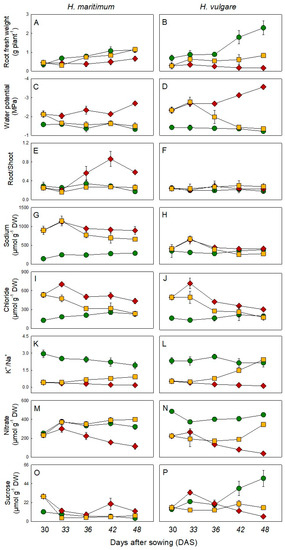 In H. maritimum and H. vulgare under salinity at 30 DAS the sodium concentration was 896 (6.3-fold higher than the respective control) and 409 μmol g−1 DW, respectively. The sodium concentration underwent a statistically significant change (p < 0.05) at 33 DAS in both species.