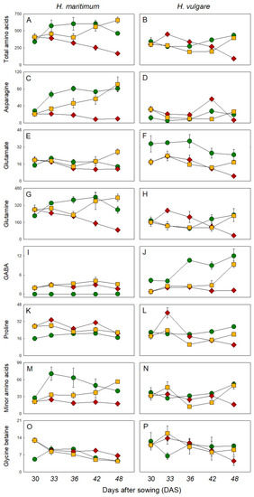 Salt stress induced a change of root amino acid profile in both species (Figure 2, Table S1). In H. maritimum under salinity, asparagine, ornithine and minor amino acids steadily decreased while GABA increased. Aspartate and glutamate had initially a concentration higher than respective controls but they decreased from 33 DAS together with glutamine. In H. vulgare under salinity the majority of amino acids decreased compared with the respective controls. The contents of GABA, glutamate and ornithine were lower than those of control for the entire experimental period. Alanine and glycine concentration decreased from 36 DAS, while minor amino acids, which showed a concentration similar to that of control for almost all the experimental period, strongly decreased at 48 DAS. Initially, in the cultivated species, asparagine and glutamine increased and then decreased towards the end of the experiment. The content of aspartate showed a fluctuating trend resulting 2.6-fold lower than respective control at 48 DAS. An opposite trend was observed for proline content, moreover salt stress increased it in both species being, however, on average doubled in H. vulgare compared with H. maritimum. For the majority of amino acids, the removal of salt stress cancelled the impact of the first phase of salt treatment (15 days) and corrected their levels to nearly the control ones in the cultivated species, while some of them significantly increased in the wild species compared to control. In particular, the amino acids that at 48 DAS of the recovery treatment strongly increased in H. maritimum compared to the respective control were alanine (+2.9-fold), aspartate (+2.2-fold), GABA (+43.7-fold), glutamine (+1.4-fold) and minor amino acids (+1.4-fold) (Figure 2; Table S1). H. vulgare control plants had, on average, a higher glycine betaine (GB) concentration (+51.4%) than H. maritimum and was not particularly influenced by salinity except at 33 and 48 DAS being 2.1-fold higher and 2.3-fold lower than respective controls. Salt stress increased its content in H. maritimum at 30, 42 and 48 DAS (Figure 2O,P).