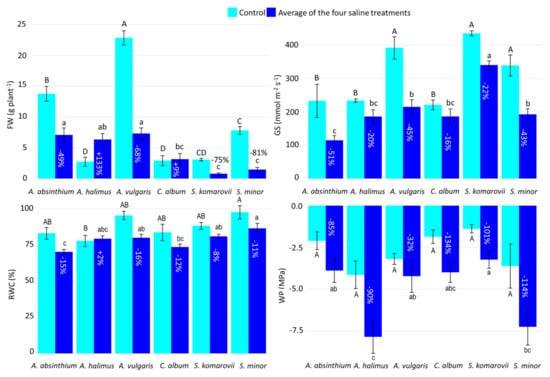 Fresh weight (FW), stomatal conductance (GS), leaf relative water content (RWC), and leaf water potential (WP) of the six halophyte species under control (cyan histograms), and the four saline treatments combined (blue histograms). The percent difference between control and the combined saline treatment is reported for each species as % in the saline treatment column. Uppercase and lowercase letters indicate statistical differences (p ≤ 0.05) among the six species in controls and average saline treatment respectively. Vertical bars indicate ± one standard error.