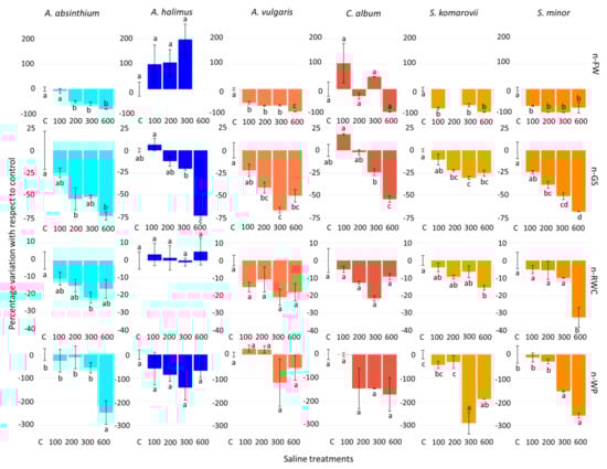 Control-normalized percent differences in fresh weight (n-FW), stomatal conductance (n-GS), leaf relative water content (n-RWC), and leaf water potential (n-WP) within species due to the different saline treatments experimented in the study. Different letters indicate significant differences at p ≤ 0.05. Vertical bars indicate ± one standard error. In A. halimus and S. komarovii, one n-FW level is missing due to dead plants at harvest.