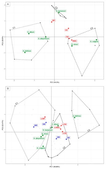 The position of the barycenters of the six species in the two PCs changed drastically from control to saline treatments (Figure 3). In the Control PCA, the PC1 had negative loadings for A. halimus and C. album, and positive loadings for A. vulgaris and S. minor (green barycenters in Figure 3A). Conversely, in the Control-normalized PCA, the PC1 had negative loadings for A. vulgaris and S. minor, and positive loadings for A. halimus and C. album (green barycenters in Figure 3B). This suggests that the last two species were the best performing under salt stress conditions (no substantial FW, GS and RWC drop) although they resulted in being the worst performing under control conditions (lowest FW, GS, and RWC values). The barycenters of S. komarovii and A. absinthium in the PCA biplot did not vary substantially along PC1 due to saline treatments. S. komarovii was still located on the positive side of the PC1, as it showed high-intermediate ranking both under control (highest GS) and salinity conditions (highest GS and WP). A. absinthium, as well, remained located on the negative side of the PC1, showing an intermediate performance under control and a low-intermediate performance under salinity (lowest GS and RWC). A. absinthium was likely located on the negative side of the PC1 because, despite the restrained FW drop, this species was the last ranked for RWC and GS under salinity (Figure 1).