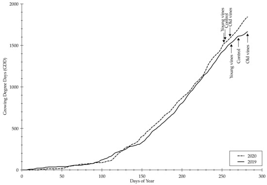 While the 2019 and 2020 growing season are classified within the same Winkler region (III), there was a 237.6 GDD difference between the two seasons (Table 1). Based on this difference, the 2020 growing season was considerably warmer. As well, the 2020 growing season had a lower annual precipitation but a higher seasonal precipitation compared to the 2019 growing season. During the growing season, there were 34 days with maximum temperatures above 35 °C in 2020 versus 30 days in 2019. Furthermore, there were six days with maximum temperatures above 40 °C in 2020 versus zero days in 2019. The six days in 2020 correlated to two excessive heat waves, both of which occurred after véraison. The average and maximum air temperature was higher in May, June, August, September, October for the 2020 growing season as compared to 2019 growing season (Table 2). Due to differences in sugar accumulation, the harvest of the Young vine treatment occurred nine days before the harvest of the Control treatment and 21 days before the harvest of the Old vine treatment during the 2019 growing season (Figure 1). Contrastingly, during the warmer 2020 growing season, the harvest of the Young vine treatment occurred two days before the harvest of the Control treatment and nine days before the harvest of the Old vine treatment (Figure 1).