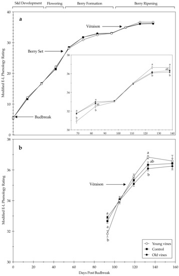 Every two weeks, phenological tracking occurred on designated data collection vines in the block to measure key phenological events (i.e., budbreak, bloom, berry set, and harvest). The Modified Eichhorn-Lorenz (E-L) system was used to determine the numerical ranking of each vine [54]. In the 2019 growing season, only Young and Old vine treatments were measured (n = 12). In the 2020 growing season, a control treatment was added consisting of four randomly selected Young vines and eight randomly selected Old vines (n = 12).