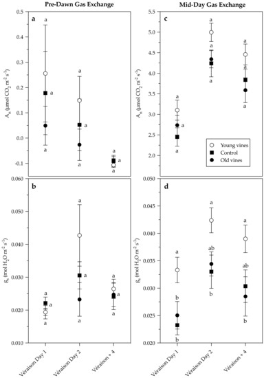 Gas exchange parameters during the 2020 growing season showing (a) pre-dawn photosynthetic rate (An), (b) pre-dawn stomatal conductance (gs), (c) mid-day photosynthetic rate (An), and (d) mid-day stomatal conductance (gs) (n = 15 for mid-day). Outliers were excluded from pre-dawn measurements (n = 5 for Young vines at véraison day 2 and Control vines at véraison + 4; n = 6 at véraison day 1). Véraison + 4 corresponds to four weeks post-véraison. Two-way analysis of variance (ANOVA) showing treatment means, with bars representing the standard error of the mean. Different letters indicate significant differences between treatment groups based on Tukey HSD. Different scales are displayed on the Y-axis of each figure. Treatment (T), growth stage (G), and T × G interactions were analyzed (p-values reported in Section 2.3).