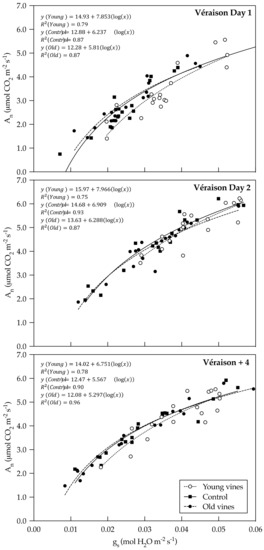 Relationships between mid-day photosynthetic rate (An) and stomatal conductance (gs) at different growth points in the 2020 growing season. Véraison + 4 corresponds to four weeks post-véraison. Curves of logarithmic regressions of Young and Old vines are significantly different on Véraison day 1 (p = 0.0152).