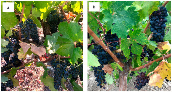 While critical temperatures inhibit photosynthesis, increased sugar concentration from these events is attributed to evaporative loss from berries [35,36]. Berry water loss and sunburn symptoms were observed during both seasons, but these symptoms were more prominent after the 2020 heatwave events (Figure 5). Furthermore, these symptoms were expressed earlier in the 2020 growing season (Figure 5). These symptoms could be minimized by canopy size [37]. Differences in canopy size have been reported, with young vines displaying smaller canopy size up until the fourth year after planting compared to old vines [27]. This trend needs to be further investigated on cv. Zinfandel vines. The difference in harvest dates between the 2019 and 2020 growing season was most likely due to both extreme temperatures, water stress, and GDD accumulation (Figure 1). Additionally, the difference in harvest dates between treatments could be attributed to a greater tolerance for high temperatures in older vines, possibility due more extensive root systems [2,23,27] or greater canopy size [2,27].