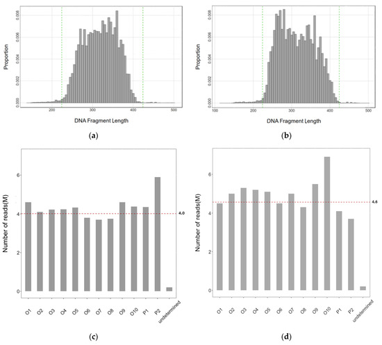 We collected sequence read data from two pooled sequence libraries for diploids and tetraploids of Solanum tuberosum L., each of which comprised 12 samples (two parental lines and 10 offspring). The diploid and tetraploid potato strains used to generate the offspring populations are detailed in Section 4. The designed length of DNA segments targeted in the RAD-seq experiment varied between 360 and 560 bps. After chopping the adapter and PCR primer sequences of 136 bps, the actual selected DNA segments were in the range of 224–424 bps as demonstrated in Figure 1a,b, with the mean lengths of the DNA segments being 317 bp and 310 bp, respectively. Figure 1c,d show the number of reads in each of the pooled RAD-seq libraries of diploid or tetraploid potato, which was approximately equal to 4 M, i.e., the designed number of sequence reads for each of the samples, demonstrating the uniform presentation of the component samples in the pooled RAD-seq libraries. These findings show that the designed parameters of the RAD-seq library construction were well met and realized.