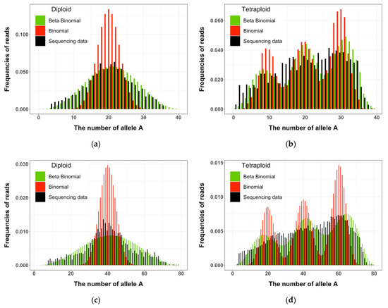The RAD-seq data collected from this study were used to fit the two alternative sampling distributions (binomial distribution and β-binomial distribution). However, sequence coverage and polymorphic segregating alleles may vary considerably from one polymorphic site to the other in the RAD-seq dataset. To minimize these influences, we further screened the RAD-seq data to be included into the model fitting on the basis of the following screening and grouping criteria: the selected data for the modeling fitting must carry a polymorphic site with at least two alleles in the diploid or tetraploid samples and have a coverage of . The selected sequence data were then grouped according to their coverage into [20,60), [60,100). Within each of the groups, we assigned one of the polymorphic nucleotides (usually the one from the reference genome) as allele A and the other as a, and the number of A-carrying sequence reads was counted as nA. The number of the polymorphic sites in each of the groups was denoted by M.