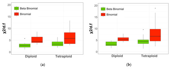 The boxplot of for the goodness-of-fit test between the observed and expected numbers of sequence reads under two alternative distributions at two coverages (20–60 on the left (a) and 60–100 on the right (b)) from diploid and tetraploid potato.