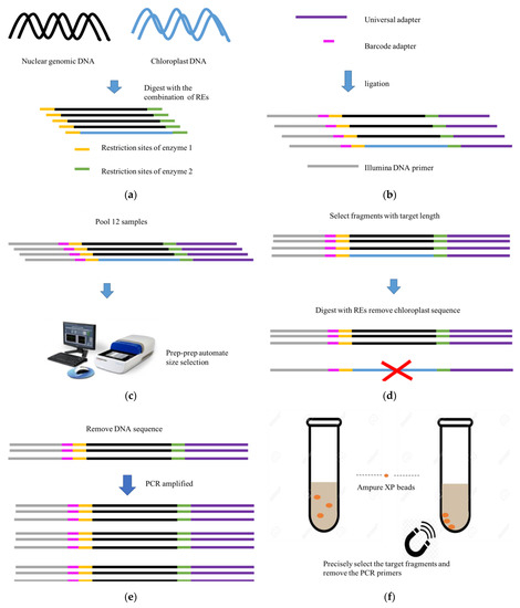 Diagrammatic workflow of the optimizing RAD-seq library construction in the present study. (a) Digesting genomic DNA into DNA fragments with designed lengths. (b) Adding adapters on both sides of the selected DNA fragments. (c) The first round of fragment size selection with Pippin prep. (d) The second digestion to remove DNA fragments from the chloroplast genome and/or RNA genes. (e) PCR amplification. (f) The second round of fragment size selection with Ampure XP beads.
