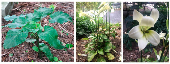 - Araki, K.; Shimatani, K.; Nishizawa, M.; Yoshizane, T.; Ohara, M. Growth and survival patterns of Cardiocrinum cordatum var. glehnii (Liliaceae) based on a 13-year monitoring study: Life history characteristics of a monocarpic perennial herb. Botany 2010, 88, 745–752. [Google Scholar]