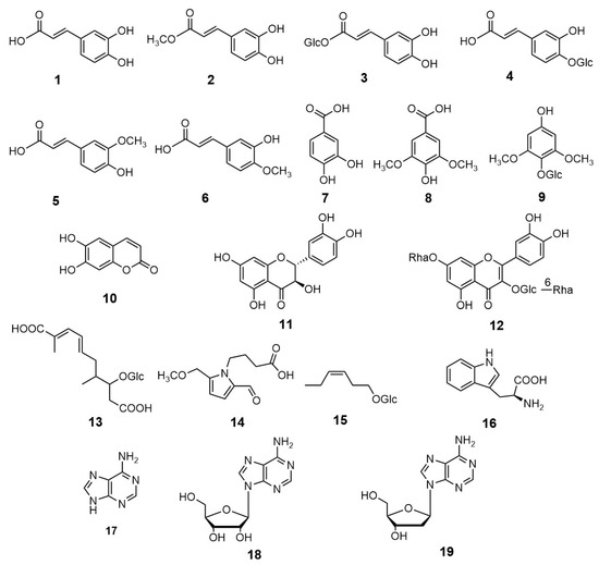The dried young leaves of C. cordatum were extracted with methanol (MeOH) and the extract was then subjected to repeated column chromatography on MCI gel CHP20P, Sephadex LH-20, ODS and silica gel to isolate 19 pure compounds. The structures of isolated compounds were elucidated on the basis of their 1H, 13C- and 2D-nuclear magnetic resonance (NMR) spectroscopic data, and by comparison with literature values as caffeic acid (1) [12], caffeic acid methyl ester (2) [12], caffeic acid β-glucopyranosyl ester (3) [13], caffeic acid 4-O-β-glucopyranoside (4) [13], ferulic acid (5) [14], isoferulic acid (6) [14], protocatechuic acid (7) [15], syringic acid (8) [15], 2,6-dimethoxy-p-hydroquinone 1-O-β-glucopyranoside (9) [16], esculetin (10) [17], taxifolin (11), quercetin 3-O-(6-O-α-rhamnopyranosyl)β-glucopyranoside-7-O-α-rhamnopyranoside (12) [18], 2,7-dimethyl-2,4-diene-deca-α,ω-diacid β-glucopyranoside (13) [19], 4-[formyl-5-(methoxymethyl)-1H-pyrrol-1-yl]butanoic acid (14) [20], (3Z)-3-hexenyl β-glucopyranoside (15) [21], tryptophan (16), adenine (17), adenosine (18) [22] and 2-deoxyadenosine (19) [22] (Figure 2).