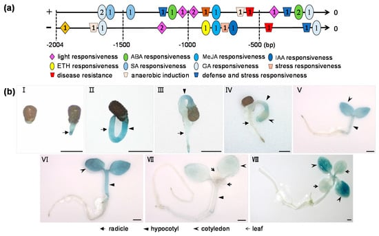 A GUS staining assay was then conducted to study the tissue expression of NtCIPK23 during seedling germination and early developmental stages, using the ProNtCIPK23::GUS transgenic lines. Evident GUS activity was detected in the radicle and hypocotyl when the testa was ruptured and the radicle was exposed (Figure 2b(I,II)). During the process of hypocotyl elongation and cotyledon emergence, a slight decrease of GUS activity was observed in the hypocotyl and nascent cotyledons, while no obvious activity was detected in the radicle tissue (Figure 2b(III,IV)). At the expansion stage of cotyledons, strong GUS activity was detected in the hypocotyl and two cotyledons (Figure 2b(V)), and when the cotyledons are fully expanded, GUS activity in the hypocotyl and cotyledons was at its peak (Figure 2b(VI)). After emergence of two leaves, the GUS activity in the hypocotyl and cotyledons declined rapidly to a much lower level, and no obvious activity was detected at the two young leaves (Figure 2b(VII)). Interestingly, it was observed that, during the growth of the two leaves, strong GUS activity in two cotyledons was recovered to a higher level (Figure 2b(VIII). GUS staining assay indicated that a series of spatiotemporal changes of NtCIPK23 occur between the seed germination and early seedling developmental stages, suggesting that NtCIPK23 transcription might be controlled under a sophisticated regulatory network.