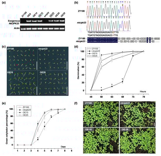Evident GUS activity in the radicle and hypocotyl during germination and early seedling growth stages implied that NtCIPK23 might function in this process. To clarify its role, the overexpressing and loss-of-function mutant lines of NtCIPK23 were generated, respectively. Two overexpressing lines (OE15 and OE25, Figure 3a) and one typical mutant line, ntcipk23, were selected for the subsequent phenotype analysis. The ntcipk23 mutant line was obtained by the CRISPR-Cas9 technique (Figure S1), and the C deletion at position 67 of NtCIPK23 CDS results in a frameshift at the 5′-terminal region of its transcripts and leads to a subsequent translation termination (Figure 3b, Figure S2).