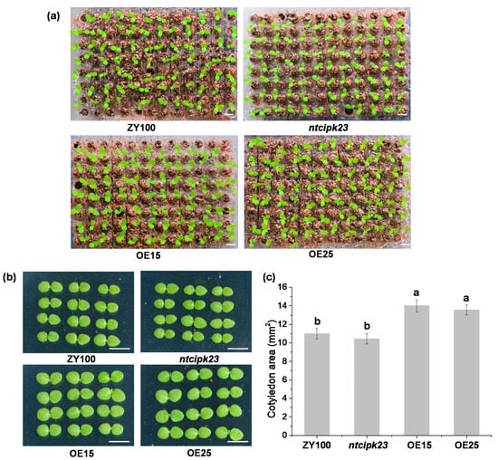 Strong GUS activity was observed in the nascent cotyledons, so the cotyledon growth of different tobacco materials was observed. It was found that, compared to ZY100, the overexpressing lines possessed larger cotyledons, while those of ntcipk23 were smaller (Figure 4a). When the cotyledons were fully expanded and the leaves emerged, the cotyledon area of each material was measured. The cotyledon area of NtCIPK23-overexpressing lines was significantly larger than that of ZY100, while the area of ntcipk23 was indicated to be slightly smaller (Figure 4b,c). The data indicated that overexpression of NtCIPK23 promotes the cotyledon expansion of tobacco seedlings.