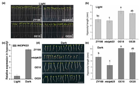 The phenotype and data analysis of hypocotyl in tobacco materials with different NtCIPK23 expression levels. (a,b) Hypocotyl phenotype of different tobacco materials under light. (c) Expression of NtCIPK23 in the hypocotyl of wild type ZY100 seedlings under the light and dark conditions. The relative transcript levels were normalized to the abundance of reference gene NtL25. (d,e) Hypocotyl phenotype of different tobacco materials in the dark. The plants under dark (wrapped by aluminum foil) were taken out at 6 DAS. Different lowercase letters (a–c) indicate significant differences at p < 0.05 according to the LSD test. The data are shown as the mean ± SE. n ≥ 20 plants, independent samples collected from three experiments. Scale bar is 1.0 cm.