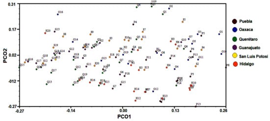 In order to estimate environmental variability, altitude, latitude, longitude, averaged soil properties, temperature and precipitation rates were recorded for each studied population. These variables were selected because of their relationship with changes in genetic and chemical variation reported in previous works [32,42,78]. For Mantel test, the climatic annual data obtained in the years 2000–2017 (historical records) were averaged. These data were kindly provided by the National Water Commission of Mexico [79] (Figures S3 and S4). For calculations, only annual climatic variation was considered whereas monthly variation was not contemplated.