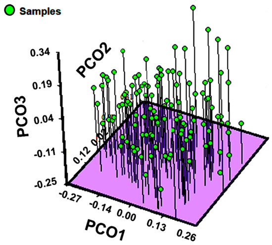 The genetic structure analysis showed that the highest genetic diversity was found within populations (94.58%). The genetic variation among populations was 1.39% according to AMOVA approaches (Table 2). The Bayesian analysis of the genetic structure showed two subpopulations (K = 2) based on the maximum value of ΔK (Figure 3). Contrastingly, the results obtained from the principal coordinate analysis with modal clustering (PCO-MC) did not produce significant clusters. The corresponding 2D plot which was based on principal coordinates (PCO1 and PCO2) (Figure 4), showed that the studied individuals were not distributed in specific clusters. This result was clearly endorsed in the 3D projection (PCO1, PCO2 and PCO3) which revealed that all the samples belong to the same group (Figure 5). FSC (permuting haplotypes among populations within groups) and FST indexes applied to the obtained groups showed statistically significant (p ˂ 0.05) values of 0.04090 and 0.05423, respectively.