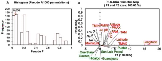 The results of partial least squares-canonical correspondence analysis (PLS-CCA) showed no significant values (Q2 = −0.328, R2Y = 0.000 and R2X = 0.725). Interestingly, the results of the permutation test (Pseudo F = 0.054; p = 0.824) revealed that genetic diversity was not linearly correlated with environmental variables (p > 0.05) (Figure 10A). These results were endorsed with inertia percentages (PLS-CCA) and eigenvalues. According to our results, 94.846% inertia was found in CCA-unconstrained and only 5.154% was associated to CCA-constrained, both presented eigenvalues of 0. The map of canonical correspondence analysis did not show any association among sites, genetic diversity and environmental variables (Figure 10B).