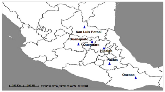 Geographical location of Brickellia veronicifolia populations grown in Mexico.