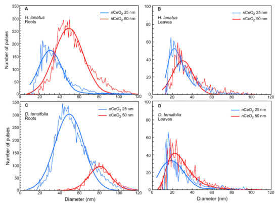 Particle size distribution of nCeO2 25 nm (blue) and 50 nm (red) extracted by enzymatic digestion procedure from roots (A) and leaves (B) of H. lanatus, and from roots (C) and leaves (D) of D. tenuifolia.