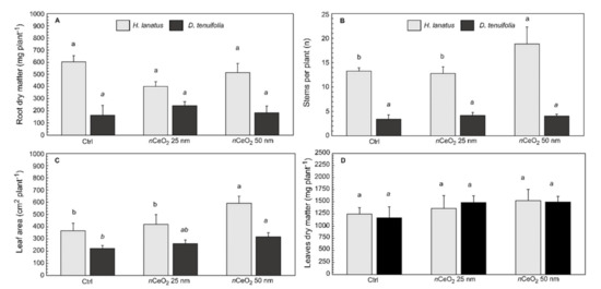 (A) Root dry matter, (B) number of stems per plant, (C) leaf area and (D) leaf dry matter ± standard deviation of H. lanatus and D. tenuifolia. Comparison between control and plants grown in presence of 200 mg kg−1 nCeO2 having respectively 25 nm and 50 nm. For each species the statistically significant difference (p ≤ 0.05) between treatments is indicated by the letters using one-way ANOVA follow by Tukey’s test.