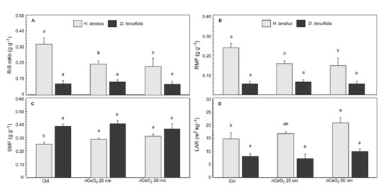 (A) Root to shoot ratio (R/S ratio), (B) Root mass fraction (RMF), (C) Stem mass fraction (SMF) and (D) Leaf area ratio (LAR) ± standard deviation of H. lanatus and D. tenuifolia. Comparison between control and plants grown in presence of 200 mg kg−1 nCeO2 having respectively 25 nm and 50 nm. For each species the statistically significant difference (p ≤ 0.05) between treatments is indicated by the letters according the Tukey’s test. −1