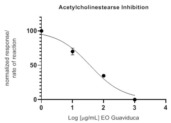 In vitro anticholinesterase activity of Piper carpunya essential oil expressed as log (concentration essential oil (EO)) vs. normalized response rate of reaction to calculate IC50 value.