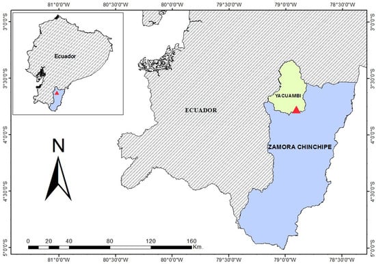 The collection of the species was performed with the authorization (N° 001-IC-FLO-DBAP-VS-DRLZCH-MA) of the Ministerio del Ambiente de Ecuador (MAE), in the surroundings of the Shuar community “El Kiim” of the La Paz parish, Yacuambi canton, Zamora Chinchipe province (Ecuadorian Amazon), at a latitude of 3°47′06″ S and a longitude of 78°54′16″ W (Figure 3). The collection was performed in the months of February–March (in winter; Ecuador only has two seasons) and October–November (summer) at an altitude of 1025 m a.s.l. The samples collected in winter were in the fruiting stage and were identified as PCW; the samples collected in the summer in the foliation stage were designated as PCS. Airtight plastic containers were used for storage and transfer of the plant material until its use. The collection and transfer temperature was 20–24 °C (room temperature), and the pressure was around 90 KPa (room pressure).