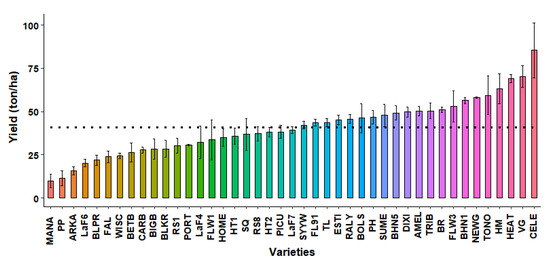 Yield (ton ha−1) of 43 genotypes grown in open-field during the spring season in 2019 at Uvalde, TX. Each bar represents mean ± standard error values. The dotted line indicates the total mean yield (40.71 ton ha−1). The varieties with similar yield responses are denoted by the same bar color.