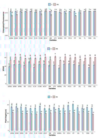 Chlorophyll fluorescence has been widely used for heat-stress screening under controlled heat-stress conditions [8,9]. A decrease in chlorophyll fluorescence under heat stress is attributable to an increase in the initial fluorescence or a decrease in maximum fluorescence or both. It is well known that a decrease in maximum fluorescence results from an increase in non-photochemical quenching, leading to an increase in initial fluorescence due to photoinhibition of PSII [19,20,21]. Heat stress affected the PSII functionality of PP, ARKA, BHN1, HM, FLW3, PH and SQ, as shown by the lower chlorophyll fluorescence in these varieties.
