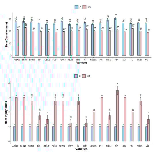 Mean stem diameter for all varieties was 7.3% lower in heat-stress conditions (Figure 2). However, there were differences in the response of different varieties under heat stress. While almost all the varieties had lower diameter under heat-stress, SQ and NEWG had 1.14% and 28.56% higher diameter, respectively, compared to their control-treated counterparts.
