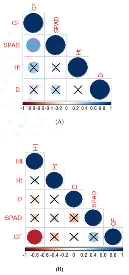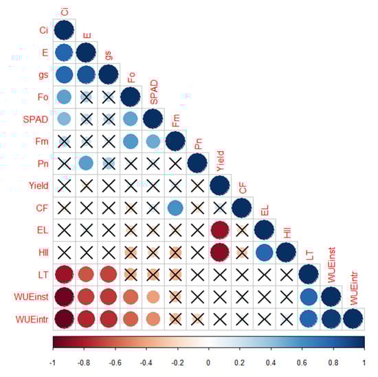 Correlogram showing the relationship between average values of the variables in open-field conditions. The intensity of color and size of the circle increases with an increase in the significance of correlation. Dark red denotes a high negative correlation, whereas dark blue denotes a high positive correlation. The cells with cross marks denote no significant correlation between the variables. The full form of abbreviations used in the correlogram are given in the abbreviations section.