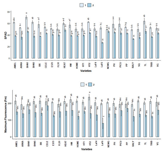 SPAD and maximum chlorophyll fluorescence (Fm) of different field grown tomato varieties at two different stages: Stage 1: 51 DAT, 34 °C and Stage 2: 86 DAT, 41°C. Different letters indicate significant differences between variety-stage combinations based on the HSD test (α ≤ 0.05). Each bar represents mean ± standard error values.