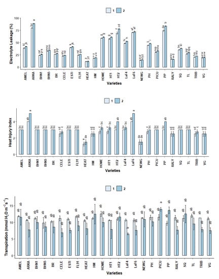 Electrolyte leakage (%), heat injury index and transpiration (mmol H2O m−2s−1) of different field grown tomato varieties at two different stages: Stage 1: 51 DAT, 34 °C and Stage 2: 86 DAT, 41 °C. Different letters indicate significant differences between variety-stage combinations based on the HSD test (α ≤ 0.05). Each bar represents the mean ± standard error values.