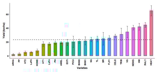 Total yield (ton ha−1) of 24 genotypes obtained in 2020. Each bar represents mean ± standard error values. The dotted line indicates the total mean yield (22 ton ha−1). The varieties with similar yield response are denoted by same bar color.