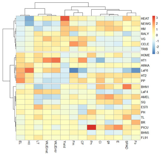 Heatmap and clustering of varieties based on the scaled values of the measured variables obtained under open-field conditions. Each row represents a variety and each column indicates a measured parameter. Treatments are clustered based on their measured variables and variables are clustered based on their correlation. The variables that are clustered together have a high positive correlation. Cells with red and blue color have high and low relative expression, respectively.