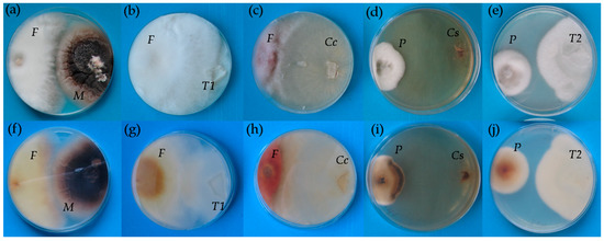 The growth of co-occurring Microdochium bolleyi and Fusarium culmorum (a,f), Tulasnella sp. 2016/11 and F. culmorum (b,g), Ceratobasisium cereale and F. culmorum (c,h), Ceratobasidium sp. 2015/1 isolate and Pyrenophora teres (d,i) and Tulasnella sp. 2015/2 and F. culmorum (e,j). Top view (a–e) and bottom view (f–j) on the same Petri dishes with potato-dextrose agar. F—F. culmorum, M—M. bolleyi, T1—Tulasnella sp. 2016/11, Cc—C. cereale, P—P. teres, Cs—Ceratobasidium sp. 2015/1, T2—Tulasnella 2015/2.