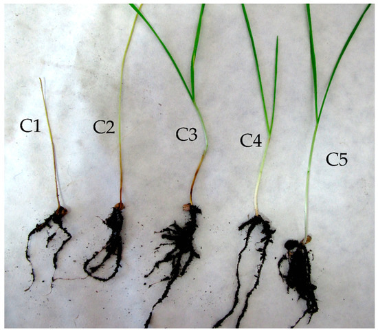 The evaluation was done by counting the number of seedlings that were divided into distinct groups depending on crown rot expression (Figure 2) and measuring a dry mass of plants in one pot or counted to a mean plant mass. The modified methodology of the degree of plants infestation by F. culmorum according to Beccari et al. [59] was used. Categories 1 and 2 include necrotic and chlorotic germinated plants. Category 3 covers plants with symptoms like the browning of the root neck that indicates the pathogen invasion. In category 4, there are plants with a little brown spot on the top of the root neck. Category 5 indicates plants with no visual symptoms. These 5 categories were coupled into 3 groups—category 5 as symptomless plants, 3–5 categories as vital plants, categories 1–5 as all plants emerged.