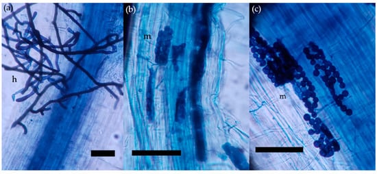 Samples of roots were taken to evaluate the colonization by endophytic fungi (Figure 3). After harvesting, the roots were transferred into 70% ethanol to be fixed. Colonization of roots by the endophytic fungus was assessed by microscopic examination (200× magnifications) of roots cleared in 2.5% KOH, acidified in 1% HCl and stained with 0.05% trypan blue in lactoglycerol [71]. The results are expressed as a percentage of the root’s length colonized by an endophytic fungus.