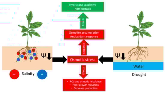 Drought and salinity together reduce global crop production by as much as 50%, and their impacts are indeed intensified by climate change [10]. These two factors exert osmotic stress on plants through a drop in soil water potential, due to restricted water availability or solute concentration, respectively (Figure 1).