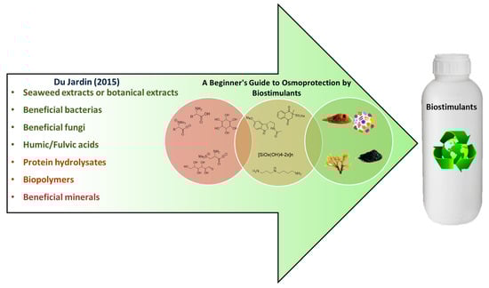 The global market in biostimulants is expected to reach $4.14 billion by 2025 [24]. In fact, many companies have already developed formulations to improve productivity under stress. These usually consist of extracts or hydrolysates from various sources [25,26], mixed with beneficial compounds acting alone as osmoprotectants [18]. This illustrates how important it is to consider the synergic effects between several molecules acting together. Indeed, it should be the best approach to combat osmotic stress, rather than the idea of finding a “magic bullet” capable of mitigating the insults alone. The aim of this review was to examine the literature and present a wide range of biostimulant sources (Figure 2) with a demonstrated capacity to increase tolerance to osmotic stress. We group them into three main categories: (1) naturally accumulated plant osmoprotectants; (2) natural and non-natural plant protectant compounds; and (3) hydrolysed biological extracts and microorganisms. This particular classification may help researchers that are beginning to delve into the field of biostimulants.