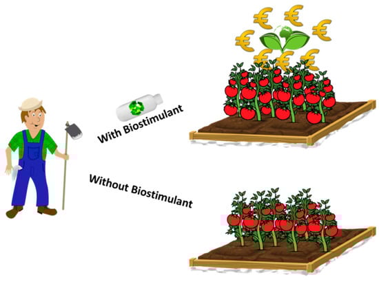 Biostimulants can be administered in the field by foliar or fert-irrigation, for example, amino acids are normally applied as protein hydrolysates. This kind of product may proceed from animal or plant sources. They are quickly gaining popularity in the industry and with farmers, because they contain a large number and quantity of bioactive compounds and have proven efficacy in enhancing crop performance, even under stress conditions [26]. Biostimulants based on amino acids are suitable for foliar application, increasing yield and grain quality after two treatments with these commercial formulations [201]. Foliar treatments are also able to increase yield under saline growth conditions [202] or growth under water deficit conditions [203,204]. Amino acid formulations can also be applied by fertirrigation to enhance fruit quality [205], improving yield under water restriction [206]. In an interesting review, Moreno-Hernandez et al. [207] summarize commercial biostimulants prepared from protein hydrolysates in a table showing their application method and crop responses. Basie et al. [208] review how biostimulants from different sources have been applied to fruit trees, grapevines and berry crops against abiotic stress, including drought and salinity. In an interesting field experiment, Kocira et al. [209] used foliar treatments of seaweed- or amino-acid-based biostimulants. Both increased yield, but the profits using seaweed extracts are higher in comparison to amino acids: EUR 752.57·ha−1 to EUR 119.67·ha−1, respectively (Figure 4).